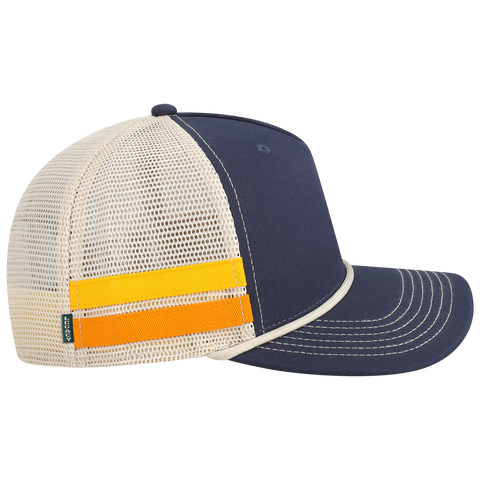 • Details : 5 Panel, Rope, Contrast stitching, Sewn stripes, mesh back, snapback, moisture wicking sweatband
